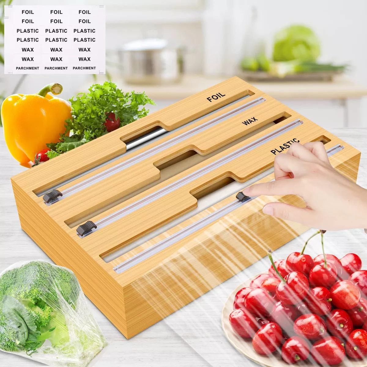 Almacenamiento de envolturas de cocina: diseñado para envoltura de plástico, papel de aluminio y papel encerado; no para rollos de más de 12 pulgadas; el organizador de bambú para organización de almacenamiento de cocina mide 3 pulgadas de alto; mide primero la altura de tu cajón.