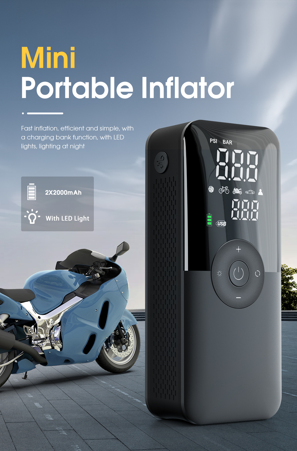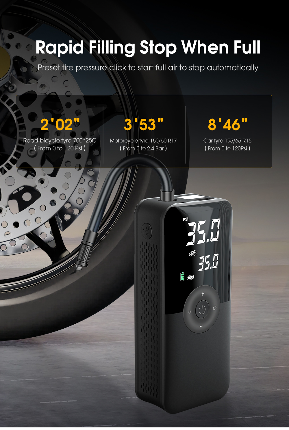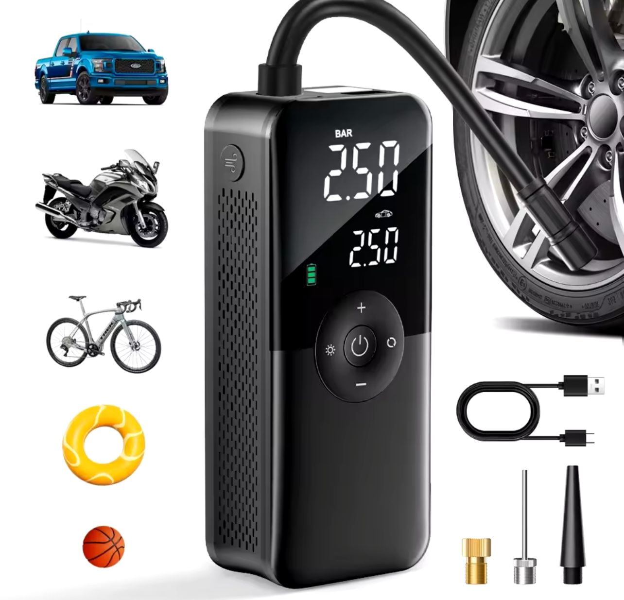 Versatilidad: Ideal para neumáticos de coche, bicicleta, moto, balones deportivos, colchones inflables, juguetes y mucho más. ¡Un solo dispositivo para todas tus necesidades de inflado!
