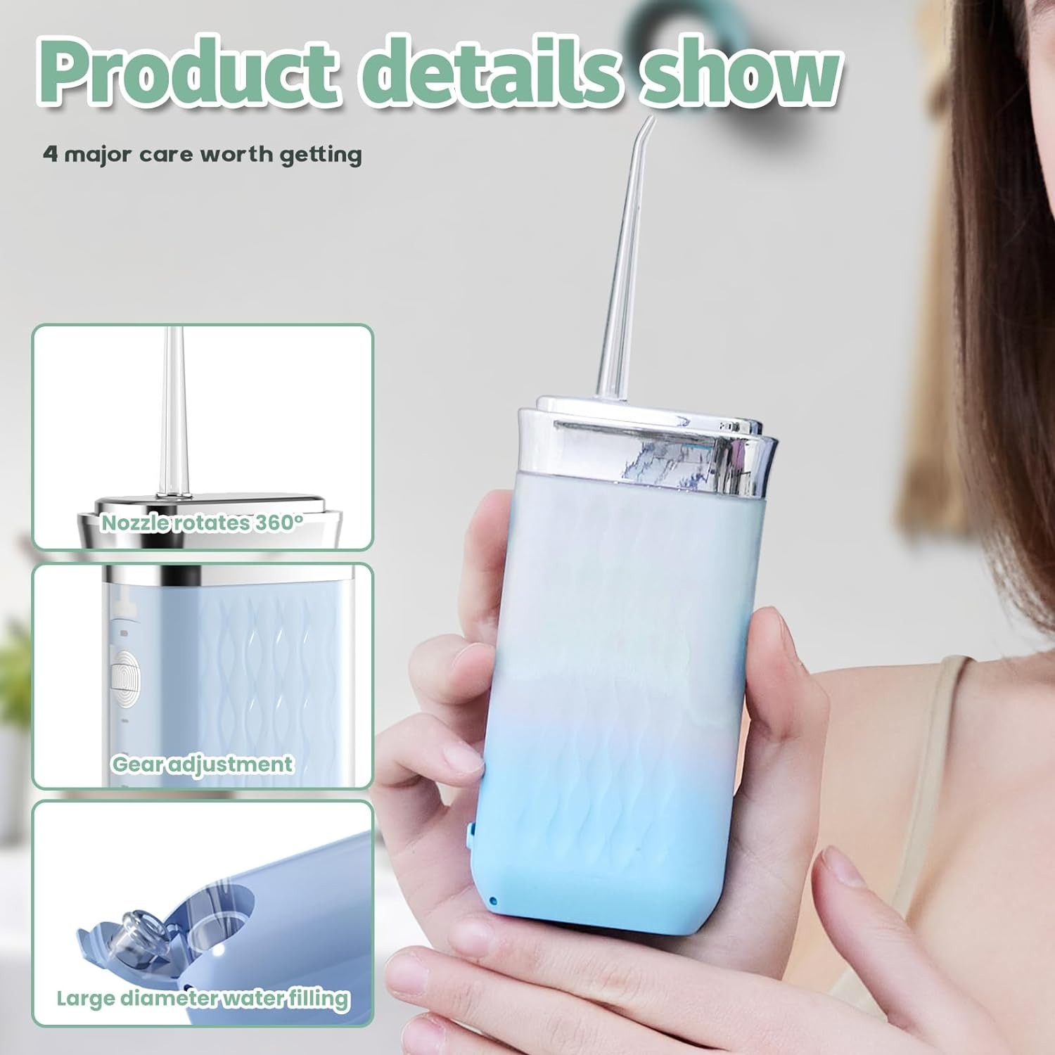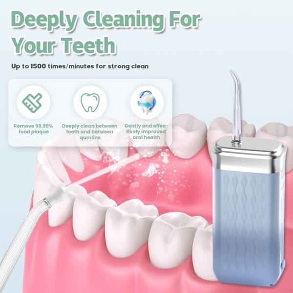 Este irrigador dental contiene una boquilla giratoria 360 para mayor flexibilidad de uso y en comparación con las personas que solo se cepillan los dientes, este producto tiene una potencia de hasta 1500 pasadas por minuto, lo que permite un área de limpieza de hasta un 40 %, limpiando eficazmente las zonas ciegas de residuos y eliminando más del 98 % de los residuos dentales.