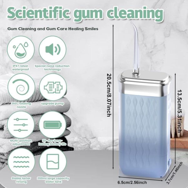 【IPX7 doble impermeable】 El irrigador bucal dental telescópico es resistente al agua hasta el nivel IPX7, se puede lavar todo el cuerpo, diseño doble impermeable, por lo que puede usarlo fácilmente sin preocuparse por los factores inseguros durante el uso. Se recomienda que los principiantes utilicen el producto paso a paso, distinguiendo estrictamente entre el área de limpieza del cepillo de dientes y el área de limpieza del hilo dental para evitar molestias causadas por un funcionamiento inadecuado.