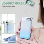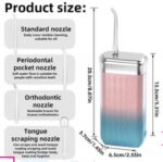 【4 tipos de boquillas】 El kit de hilo dental de agua inalámbrico de 3 modos viene con 4 tipos diferentes de boquillas. La boquilla estándar puede eliminar los residuos y es adecuada para el uso diario, la boquilla para bolsas periodontales tiene un flujo de agua suave y es adecuada para personas con dientes sensibles, la boquilla para ortodoncia puede limpiar aparatos ortopédicos y es adecuada para personas con ortodoncia y la boquilla para raspar la lengua puede limpiar la lengua. El uso de una combinación de estos productos puede proteger eficazmente la higiene bucal.