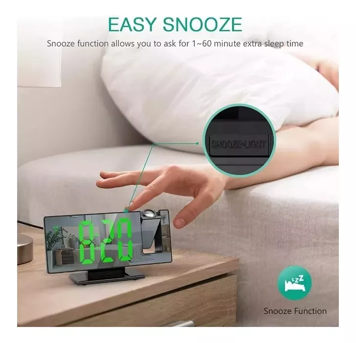 Proyección y rotación de 180°: este reloj despertador digital LED adopta un diseño de proyección ajustable giratorio de 180° (90° a -90°), lo que hace que sea fácil de leer cuando estás acostado en la cama por la noche; incluso si no estás muy despierto o sin usar gafas. (La proyección tiene 2 niveles de brillo ajustables)